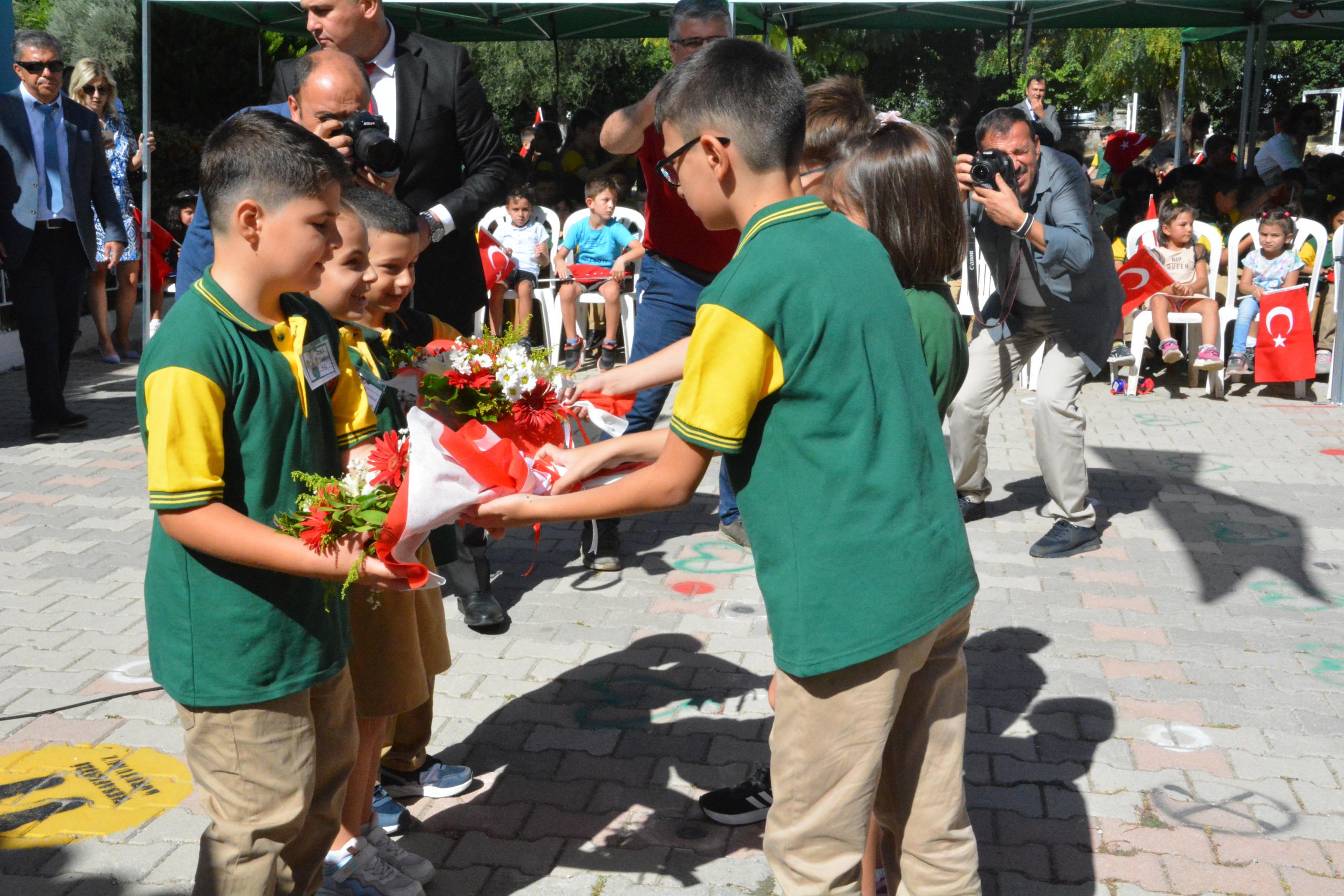 Saygı duruşu ve İstiklal Marşı’nın okunmasıyla başlayan programda, ilkokul 4. sınıf öğrencileri 1. sınıf öğrencilerine çiçek takdim ederek “okulumuza hoş geldiniz” dedi.