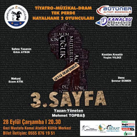***Muğla’nın Menteşe ilçesinde faaliyet gösteren Hayalhane2 Tiyatro Topluluğu, 28 Eylül Çarşamba günü Gazi Mustafa Kemal Atatürk Kültür Merkezi’nde 3. Sayfa adlı müzikal dram oyunuyla perdelerini açacak. Sevgi temalı oyunda kadına şiddete dikkat çekilerek, henüz dünyaya gelmemiş bir kız çocuğunun yaşayacakları ve bir babanın kadına şiddete dur demek için çıkmış olduğu bir serüveni anlatılacak.