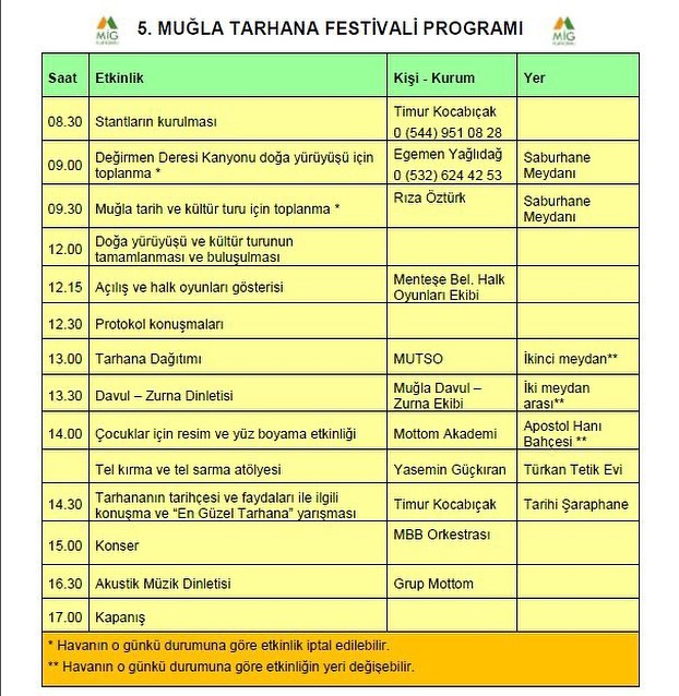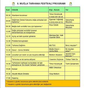 Muğla İçin Gelecek Platformu (MİG) tarafından, Muğla Büyükşehir Belediyesi, Menteşe Belediyesi ve Muğla Ticaret ve Sanayi Odasının katkılarıyla, Muğla Valiliği, Muğla Sıtkı Koçman Üniversitesi, Menteşe Kaymakamlığın destekleriyle geleneksel hale getirilen Muğla Tarhana Festivali’nin bu yıl 5.si 20 Kasım Pazar günü Saburhane Meydanı’nda düzenlenecek.