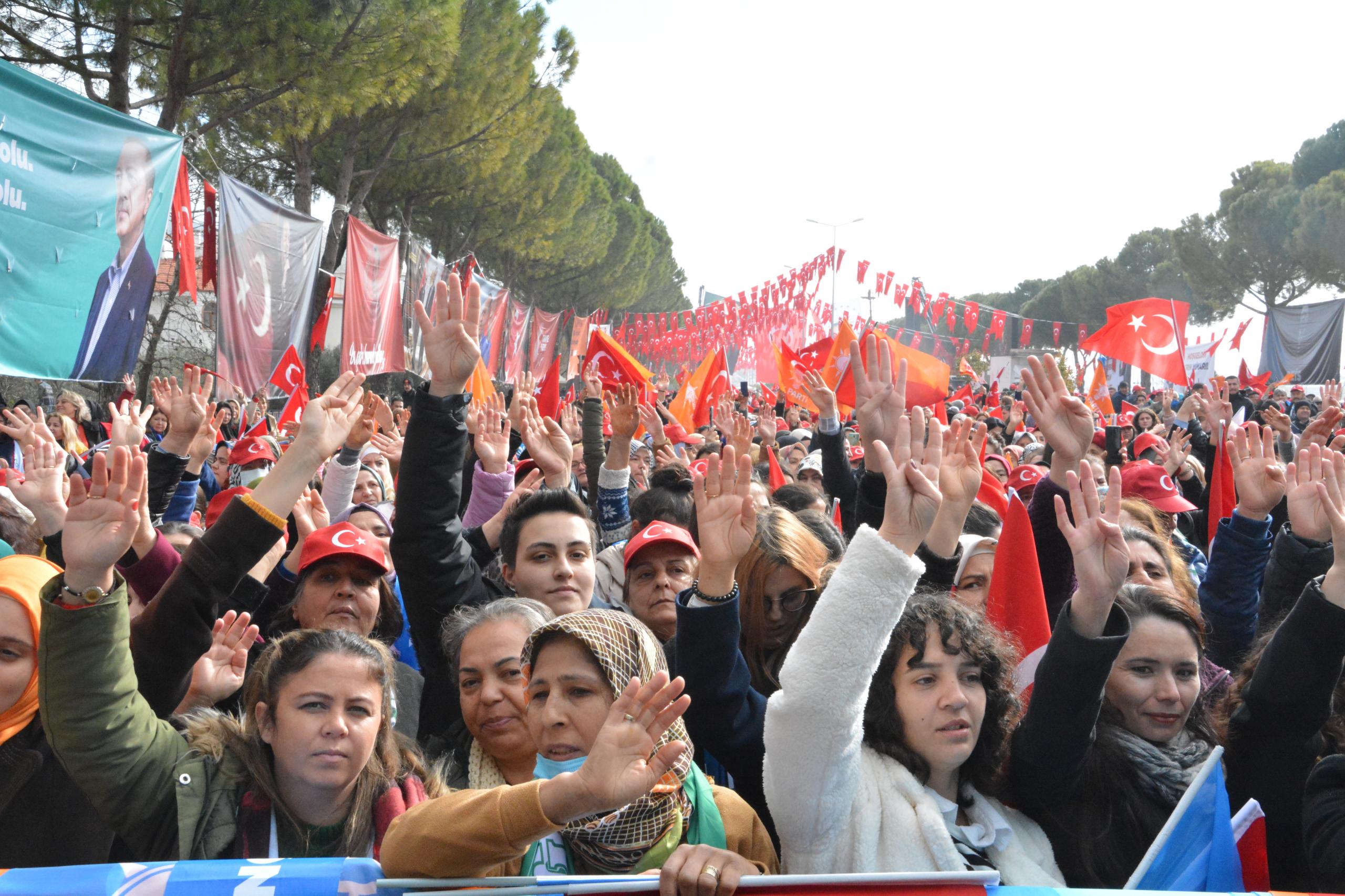 "Sağlıkta toplam 1541 yataklı 16 hastane dahil 38 sağlık tesisi inşa ettik. Çevre ve şehircilikte Muğla'da 3 bin 355 konutun yapımını tamamlayıp hak sahiplerine teslim ettik. 953 konutun yapımına devam ediyoruz. Muğla için İlk Evim projemiz kapsamında toplam 2 bin 599 konut inşa edecek, İlk Arsa projemiz kapsamında da 5 bin 500 altyapılı arsayı sizlerin hizmetine sunacağız. İktidara geldiğimizde Muğla'da 8 adet atıksu arıtma tesisiyle belediye nüfusunun yüzde 25'ine ulaşılabilir iken bugün 33 adet atık su arıtma tesisiyle belediye nüfusunun yüzde 94'üne hizmet veriyoruz. Ulaştırmada 90 kilometreden devraldığımız bölünmüş yol uzunluğuna 367 kilometre ilave yaparak toplamda 457 kilometreye ulaştırdık. Geçtiğimiz yıl 4,6 milyon yolcu kapasitesine ulaşan Dalaman Havalimanı'nı ve geçtiğimiz yıl yaklaşık 4 milyon yolcu kapasitesine ulaşan Milas Bodrum Havalimanı'nı yeniledik. Ören ve Turgut Reis yat limanlarını, Bodrum ve Güllük iskelelerini tamamlayıp şehrimize kazandırdık."