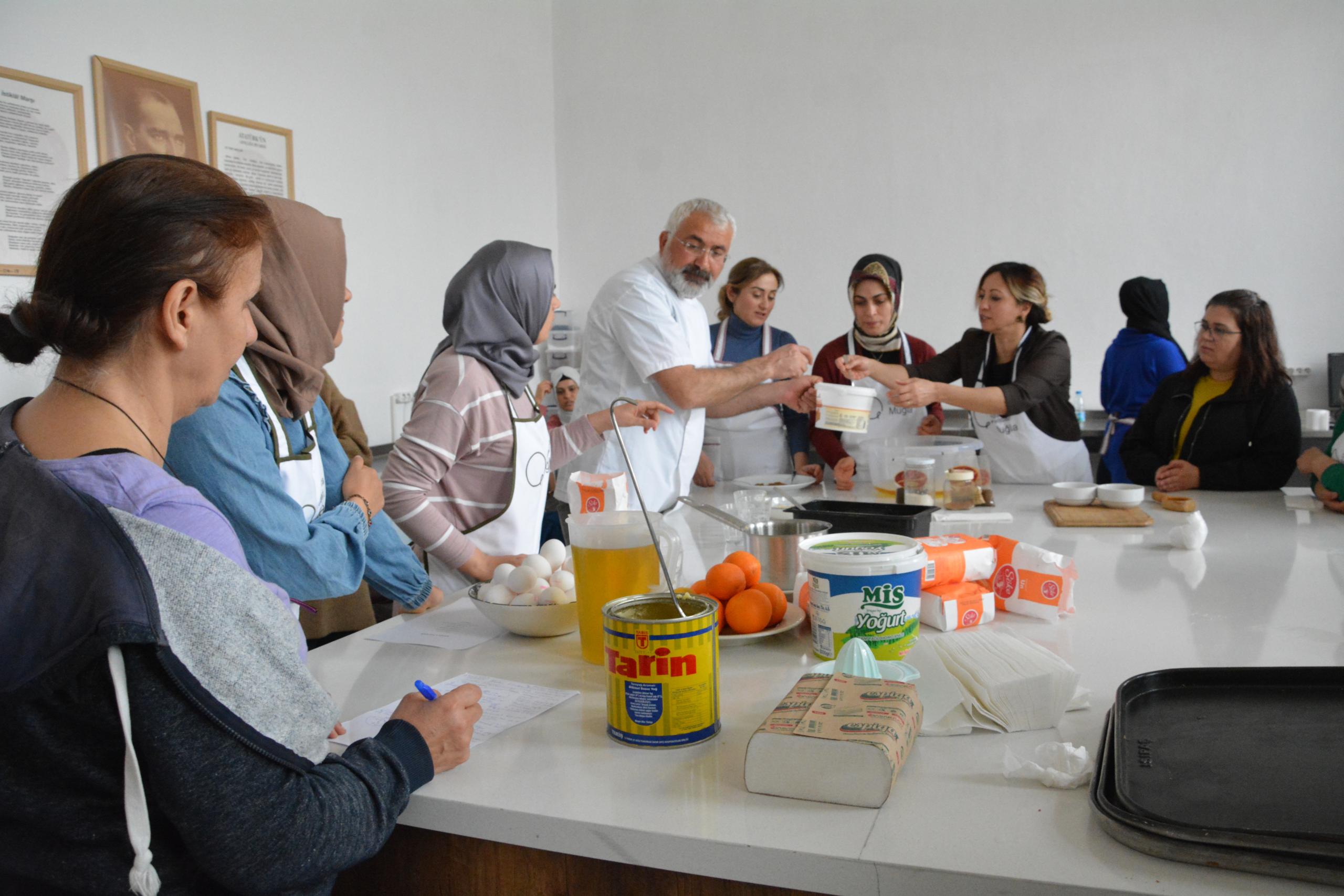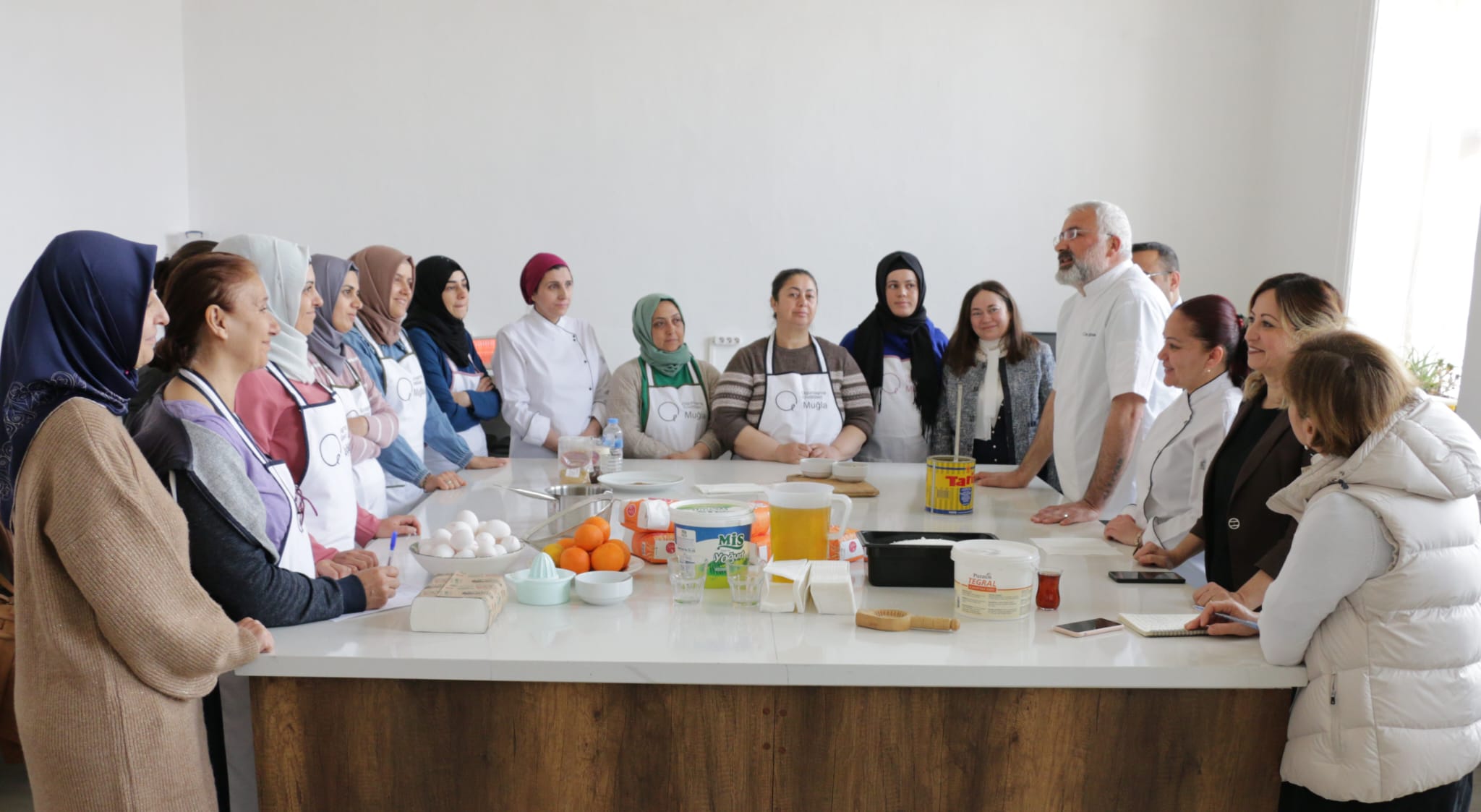 Muğla İl Milli Eğitim Müdür Yardımcısı Serap Aksel ve kursiyerler, Yiyecek İçecek Hizmetleri Öğretmeni Can Kaptan eşliğinde Hatay’dan gelen misafirlere Muğla Halkası yapmayı öğretirken, depremzedeler ise Muğlalılara Hatay Kömbesi’nin tarifini verdi.