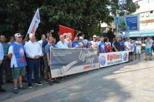MKYK üyesi Şenol Eyüboğlu ise, okulların açılmasına sayılı günlere kala iktidarın hiçbir hazırlığının olmadığını söyleyerek, “Türkiye’nin her yerinde örgütümüz alanda. Okulların açılmasına bir hafta kaldı. Siyasi iktidarın her zamanki gibi hiçbir hazırlığı yok. Okullarımızda yardımcı personel yok, atanmayan öğretmenler var. Okullarda öğretmen eksiği kalabalık sınıflar var. Sorunlarımız dağ gibi büyümüş duruyor. Ankara’da hakkını arayan öğretmenlerimiz şiddette uğradı. Buradan kınıyoruz. Siyasi iktidarlar gelip geçicidir. Bu sakın ola unutulmasın. Herkes yaptığının hesabını verecek. Tabi ki Eğitim İş kimseden talimat almadan kurulan bir sendikadır. Saraydan bir emir geldi, sözde sendikalar birden bire alandan çekildi. Öğretmenlerimizin birikmiş sorunlarına siyasi iktidar kulaklarını tıkadı. Biz sesimizi duyuracağız. Öyle saraylarda, bürolarda oturarak yüz binlere varan maaş alarak değil, örgütümüzle birlikte olarak kazanacağız. Atatürk’ün devrimci yollarında her yerde hakkımızı arayıp almayı da çok iyi biliriz. Asla kimse bizi yıldıramayacak. Eğitimin temel sorunlarını da çözeceğiz, öğretmenlerimizi ve eğitim çalışanlarının tüm haklarını da elde edeceğiz. Buradan siyasi iktidarı uyarıyoruz; aman ha öğretmenlerin üzerine saygın bir meslek olan polislerimizi göndermeyin. Biz hakkımızı almasını biliriz” diye konuştu.