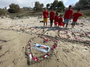 Sahile begonvil çiçekleriyle "Aylan Bebek" yazıldı. Aralarında çocukların da bulunduğu grup, savaş mağduru göçmenlerin yaşadığı drama dikkati çekti.