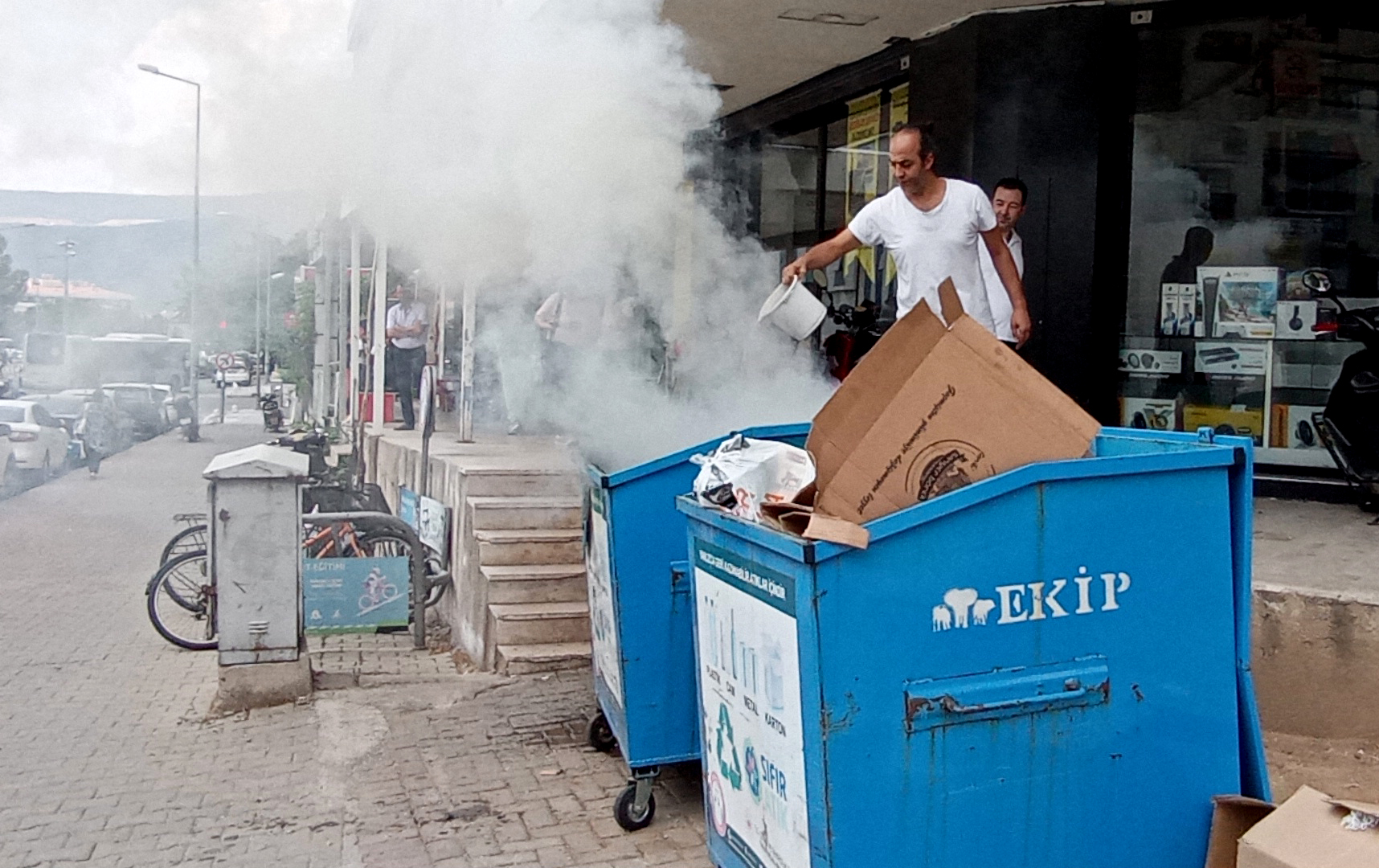 Muğla'nın Menteşe ilçesinde, geri dönüşüm kutusunda çıkan yangın elektrik trafosu ve iş yerlerine sıçramadan dükkan sahipleri tarafından söndürüldü.