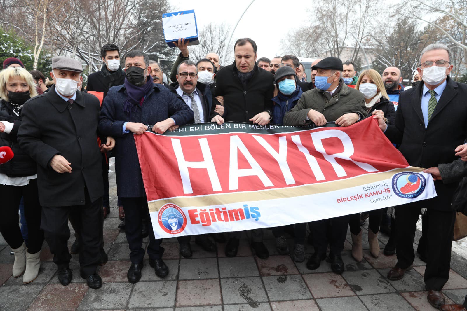 “Öğretmenlik Meslek Kanunu teklifi, eğitim emekçilerinin ve alanda örgütlü sendikaların eleştirilerine ve karşı çıkmalarına rağmen bugün TBMM Genel Kurulu'nda görüşülecek. Eğitim İş Sendikası, teklif ile ilgili açıklama yapmak ve kanun hakkında topladığı dilekçeleri TBMM Başkanlığı’na sunmak için TBMM önündeydi. Eğitim İş Sendikası’nın basın açıklaması yapma özgürlüğü ve dilekçe hakkı, iktidar tarafından engellendi. Hem öğretmenler hem vekiller hem de basın, iktidarın talimatıyla polis şiddetine maruz kaldı. Mücadele sonunda, öğretmenlerimizi içeriye aldık ve dilekçelerini Meclis Başkanvekili Haydar Akar’a sunmalarını sağladık. Direne direne kazanacağız.”