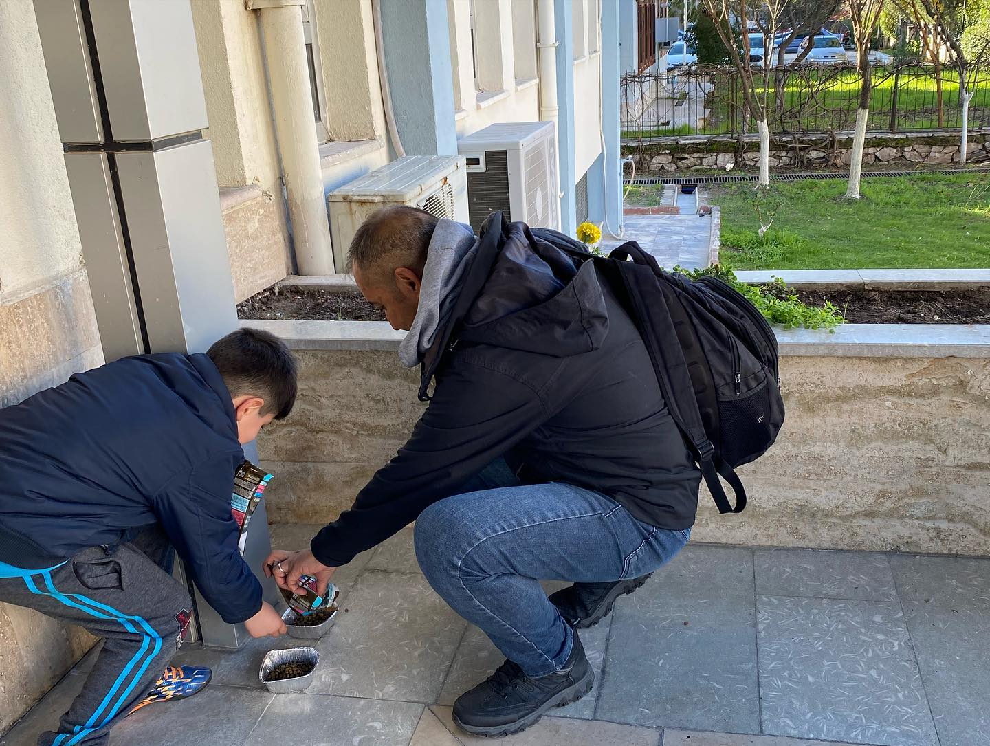 Bu kapsamda Menteşe İlçe Milli Eğitim Müdürlüğü’nü ziyaret eden Dumlupınar İlkokulu Müdürü Muzaffer Kanat, Sınıf Öğretmeni Cemal Doğan ve öğrenciler, Şube Müdürleri Eylen Terzi ve Muhammer Cihan’ın da katılımıyla ‘Can Dostlarımıza Sahip Çıkıyoruz’ sloganıyla müdürlük binasına yem ve su bıraktılar.