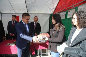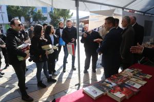 Dönmez, stantta basın mensuplarıyla bağışlanan kitaplar hakkında bir süre sohbet etti.