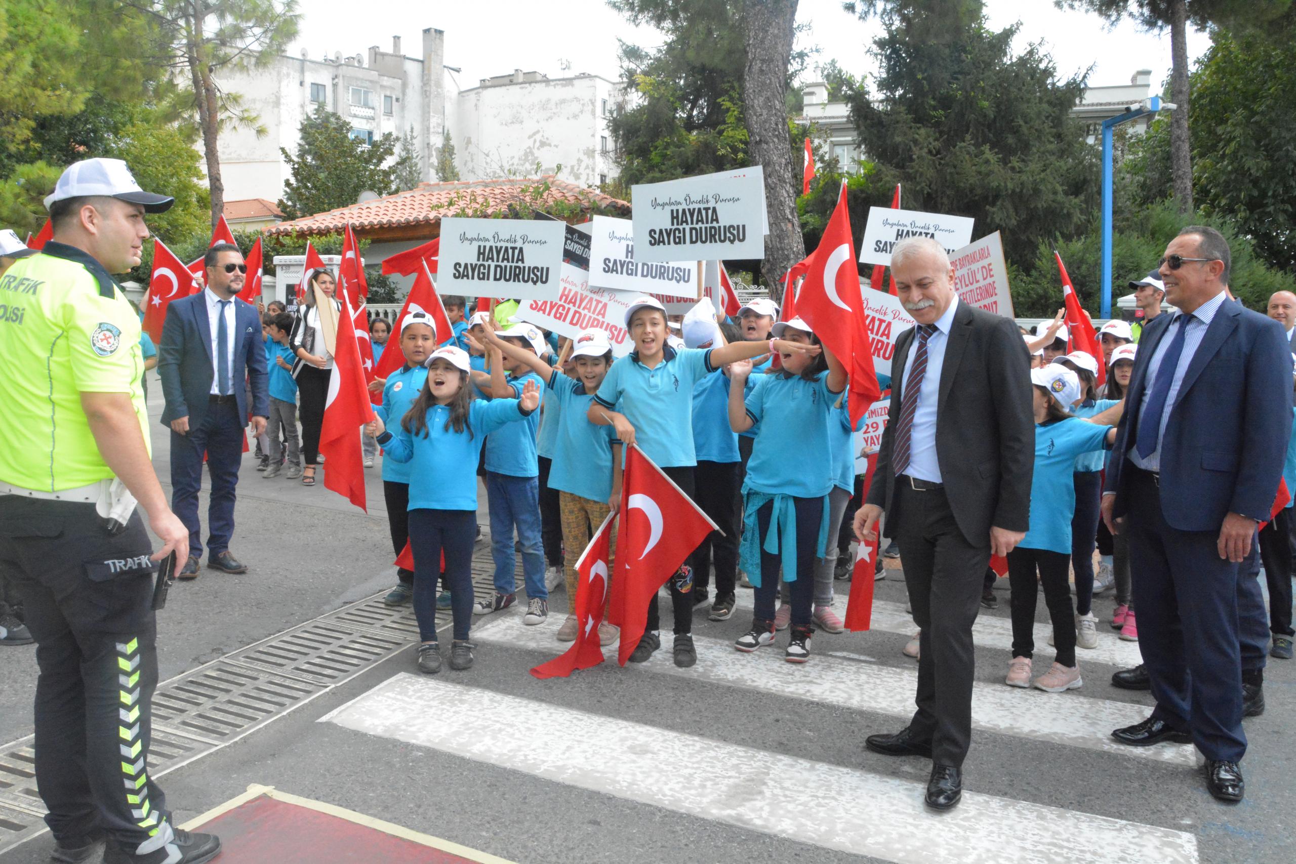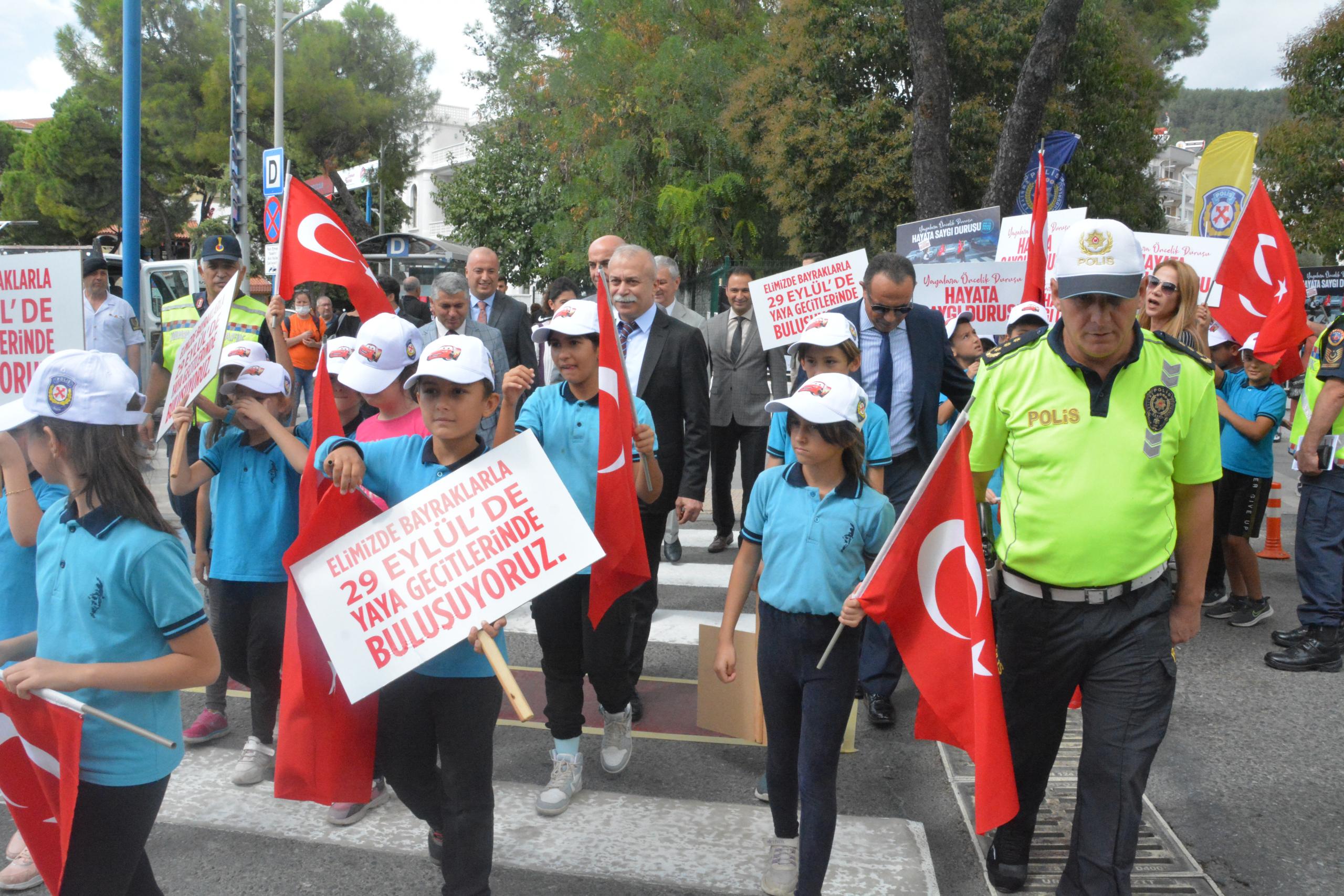 Muğla'da Menteşe ilçesinde Cumhuriyet Meydanı'ndaki Atatürk İlkokulu önündeki yaya geçidinde düzenlenen etkinlikte, öğrenciler ellerindeki Türk bayrakları ve sloganların yazılı olduğu pankartlarla yolun karşısına geçti.