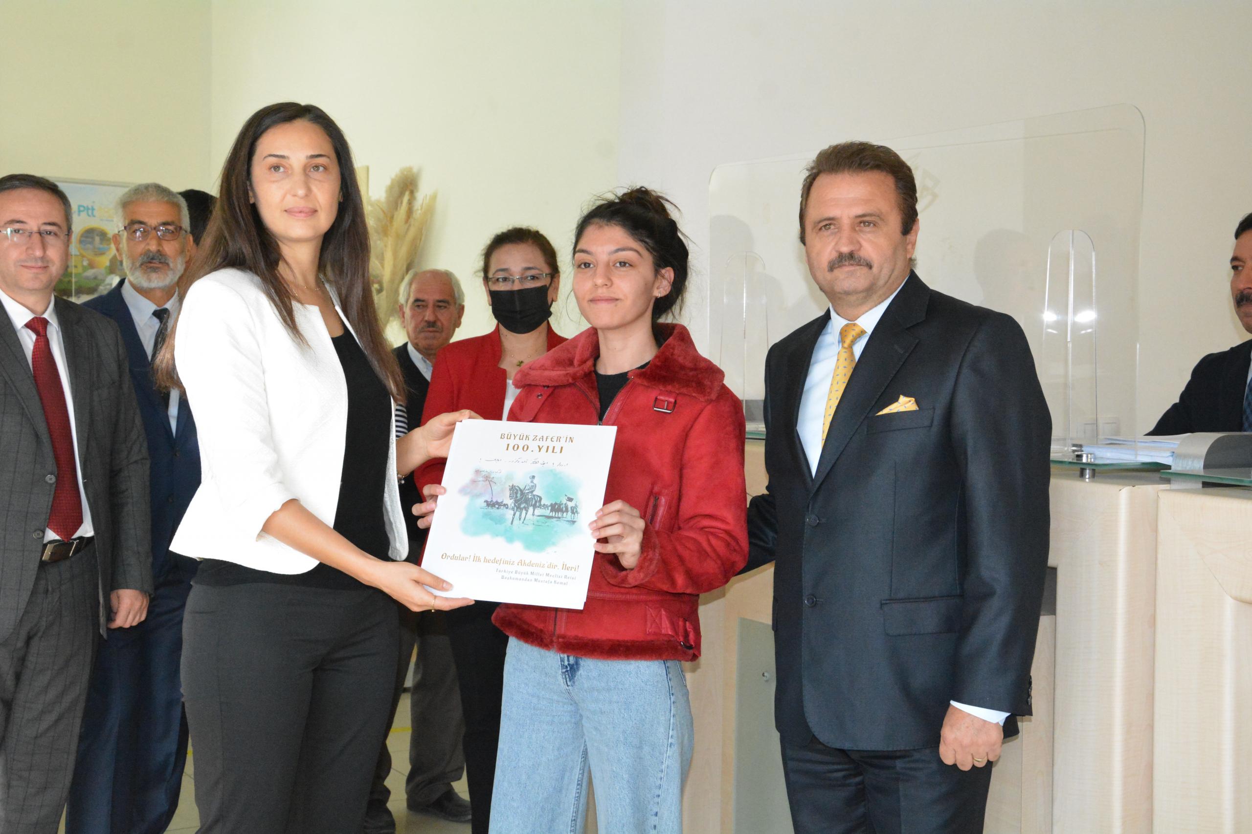 - müşteri olan Dicle Kemen’e, PTT Başmüdür Banu Büyük tarafından hediye verildi. Hediye alırken şaşkınlığını gizleyemeyen Dicle Kemen, hediye için teşekkür etti.