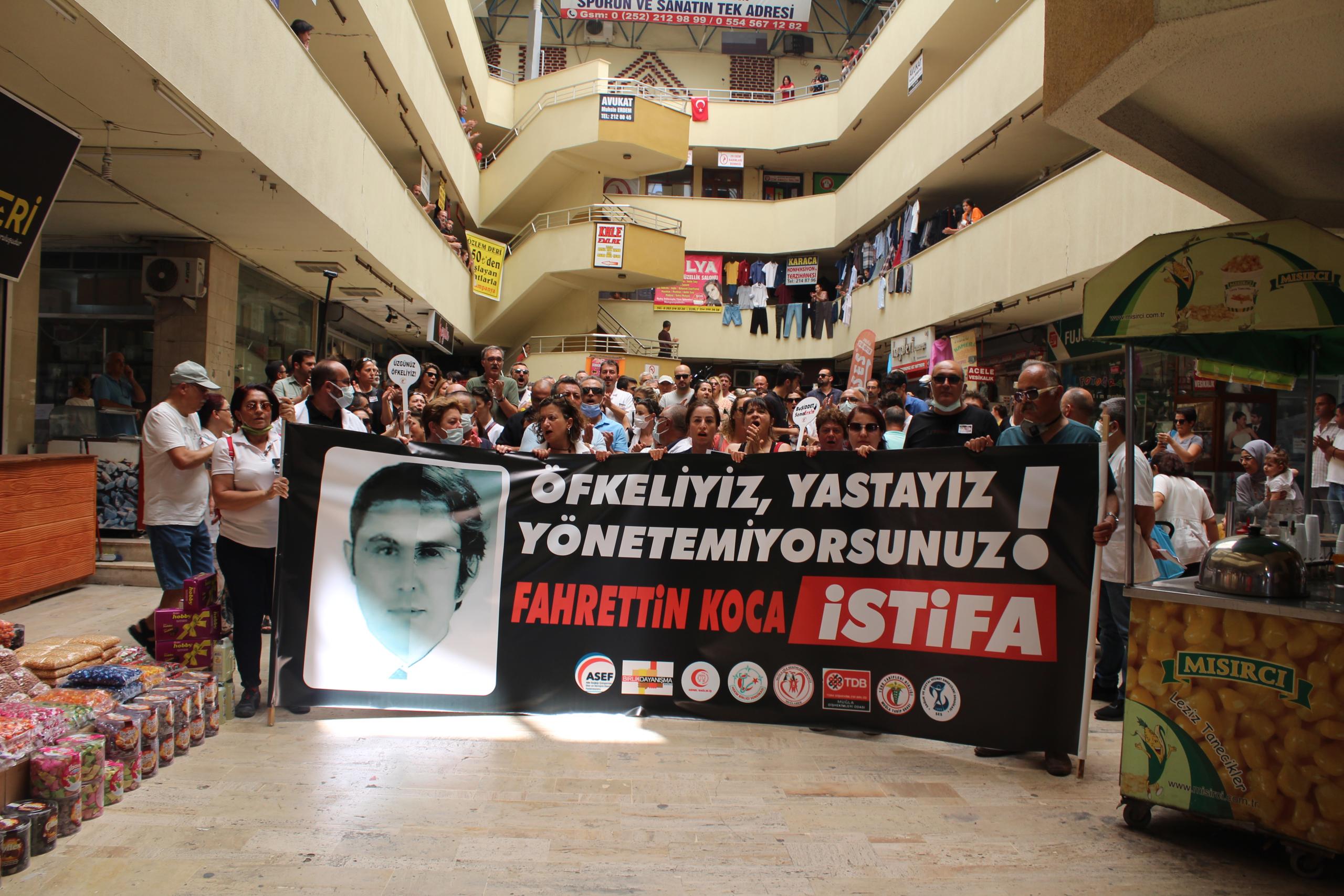 Sağlık Bakanı Fahrettin Koca’ya seslenen Tabip Odası Başkanı Cafer Şahin, “Bir arkadaşımız mesleğini yaparken, bir hasta yakını tarafından katledildi, kurşunlandı. Biz bunu ilk defa yaşamıyoruz. 10 yıl önce de yaşadık. Dün de Ekrem Karakaya’yı kaybettik. Sağlıkta ölüm politik bir tercihin sonucu. Kokuşmuş bu sistemin, çökmüş sağlık sisteminin sonucu bunlar. Bu son olacak mı? Son olsun istiyoruz. Ancak bu kokuşmuş düzen, bu çökmüş saplık sistemi devam ettiği müddetçe son olmayacağını bilmiyoruz. Yine üzüleceğiz, yine yüreğimize kor düşecek. Bu acıların son bulması için bu çürümüş düzenin son bulması için, bunun sorumluların hesap sormak için bugün buradayız. 40 gün önce 12 Eylül faşizmiyle başlayan sağlıkta dönüşüm bugün bizi buralara getirdi. 20 yıldır uygulanan tek adam rejiminin sonucu bizi buralara getirdi. Hekimlere, ‘Nereye giderlerse gitsinler’ diyenlerin teşvikleri bizi bu sonuca getirdi. Acımız büyük. Bir babayı, bir evladı, bir meslektaşımızı, bir eşi, bir insanı kaybettik. Sorumlulardan hesap sorulsun, bu düzen son bulsun. Sorumlular, sorumluluğunu yerine getiremedikleri için çekilsin istiyoruz. Sayın Fahrettin Koca tweetlerle insanlara mesaj göndermekten vazgeç artık. Çözüm üretin. Çökmüş sisteminiz artık son bulsun.” dedi.