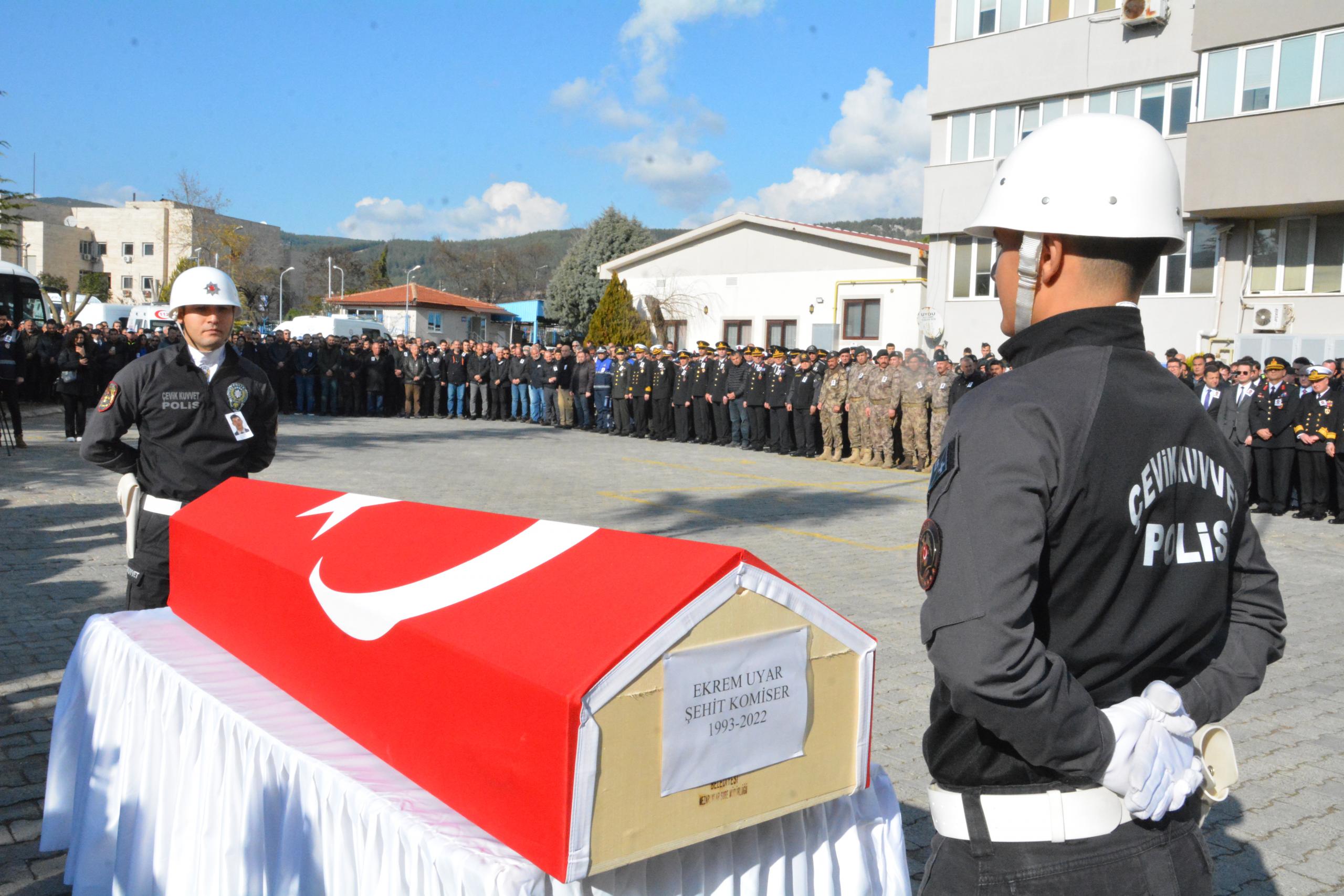 Görev dönüşü trafik kazasında hayatını kaybeden şehit Komiser Ekrem Uyar için Muğla İl Emniyet Müdürlüğü binası önünde uğurlama töreni yapıldı.