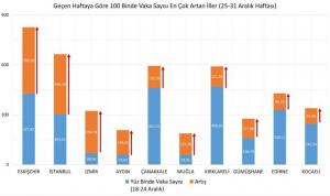 “25-31 Aralık arasında vaka yoğunluğu bir önceki haftaya göre en çok artan 10 ilimiz: Eskişehir, İstanbul, İzmir, Aydın, Çanakkale, Muğla, Kırklareli, Gümüşhane, Edirne, Kocaeli.”
