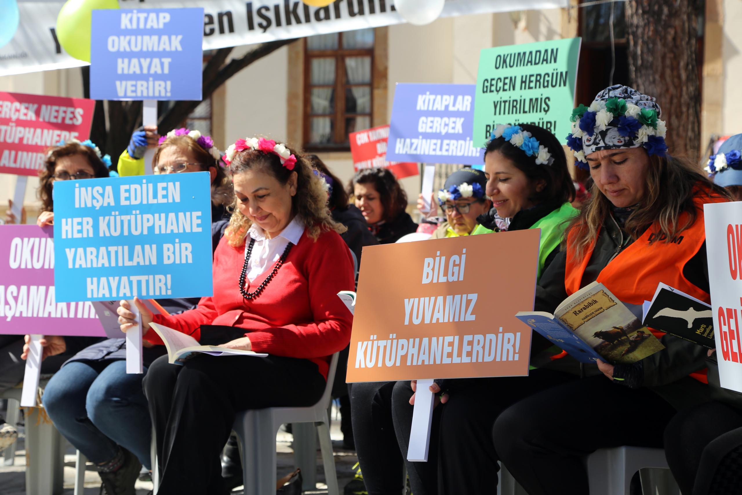 Kütüphane önünde, başlarına rengarenk çiçeklerden yapılmış taçlar takan ve ellerinde "Okumak özgürlüğe uçmaktır", "Kitap ruhun gıdasıdır", "Okumadan geçen her gün yitirilmiş bir gündür" ve "Her kitap bir okyanustur" yazılı dövizler tutan kadınlar, 10 dakikalık okuma etkinliği gerçekleştirdi.