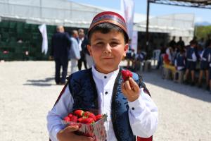 Murat Kılıç’a ait işletmeye ziyaretle devam eden etkinlik çilek şapkalı öğrencilerin çilek hasadı ile devam etti. Bol bol çilek yiyen ve çilekli süt içen öğrencilerin her biri “1963’ten Günümüze Ata Tohumları Projesi” kapsamasında domatesi biber, patlıcan, karpuz, salatalık ve çilek fidesi dikti.